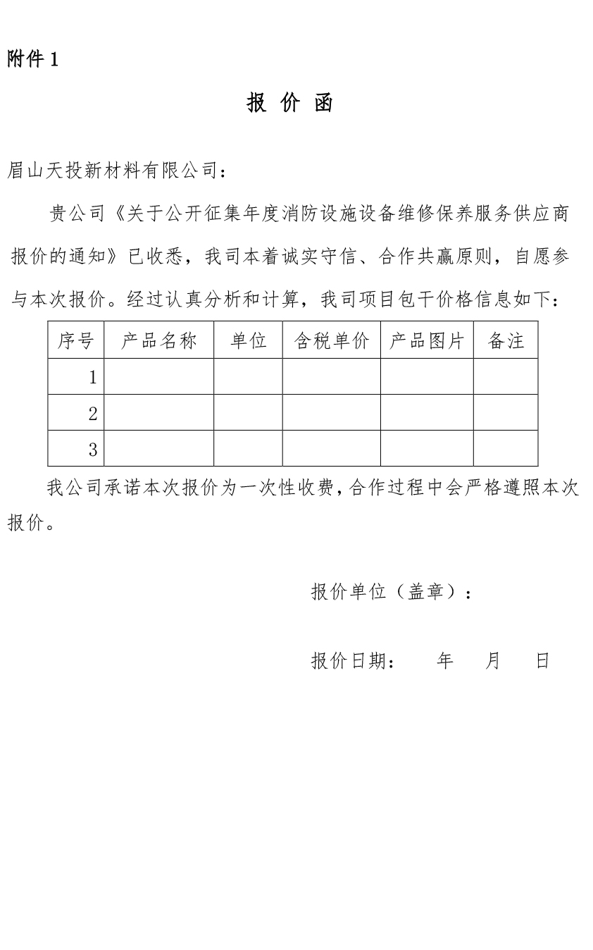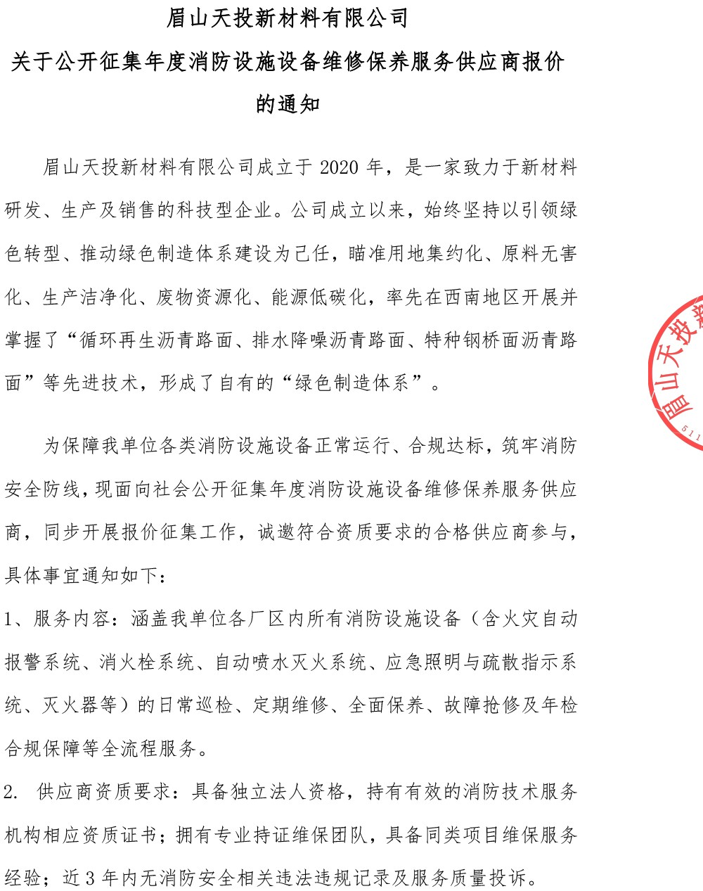 眉山天投新材料有限公司關(guān)于公開征集年度消防設(shè)施設(shè)備維修保養(yǎng)服務(wù)供應(yīng)商報(bào)價(jià)的通知